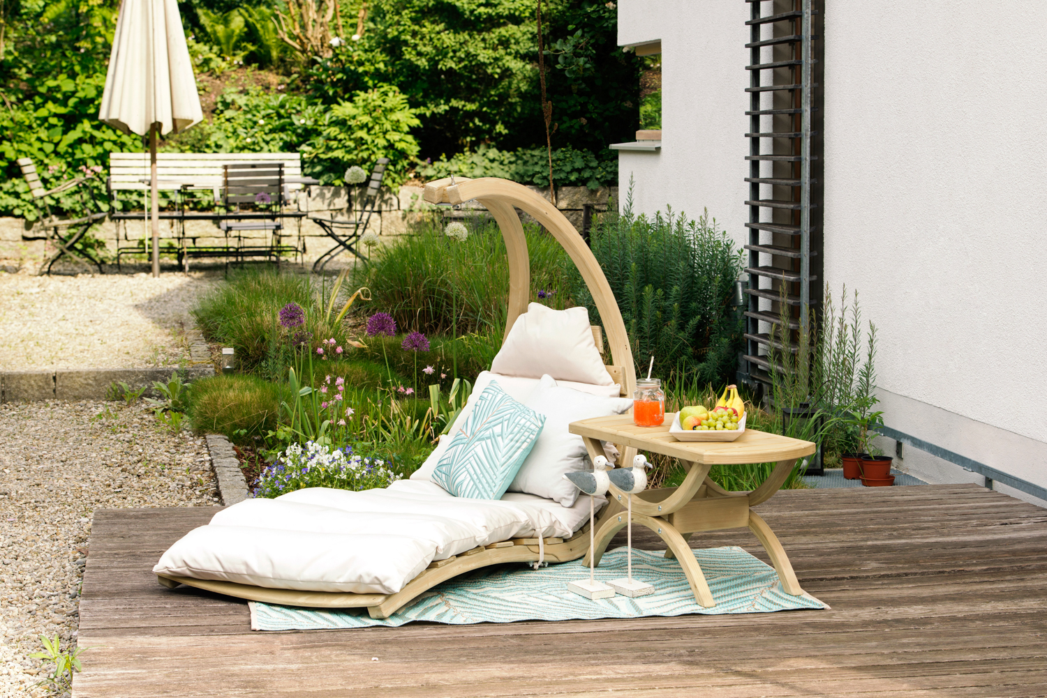 Super soft gepolsterte Schwebeliege, wetterfest, stabil und sicher. Die stilvoll geschwungene Liegefläche ist genau an den Körper angepasst und sorgt für höchsten Liegekomfort und maximale Entspannung.
