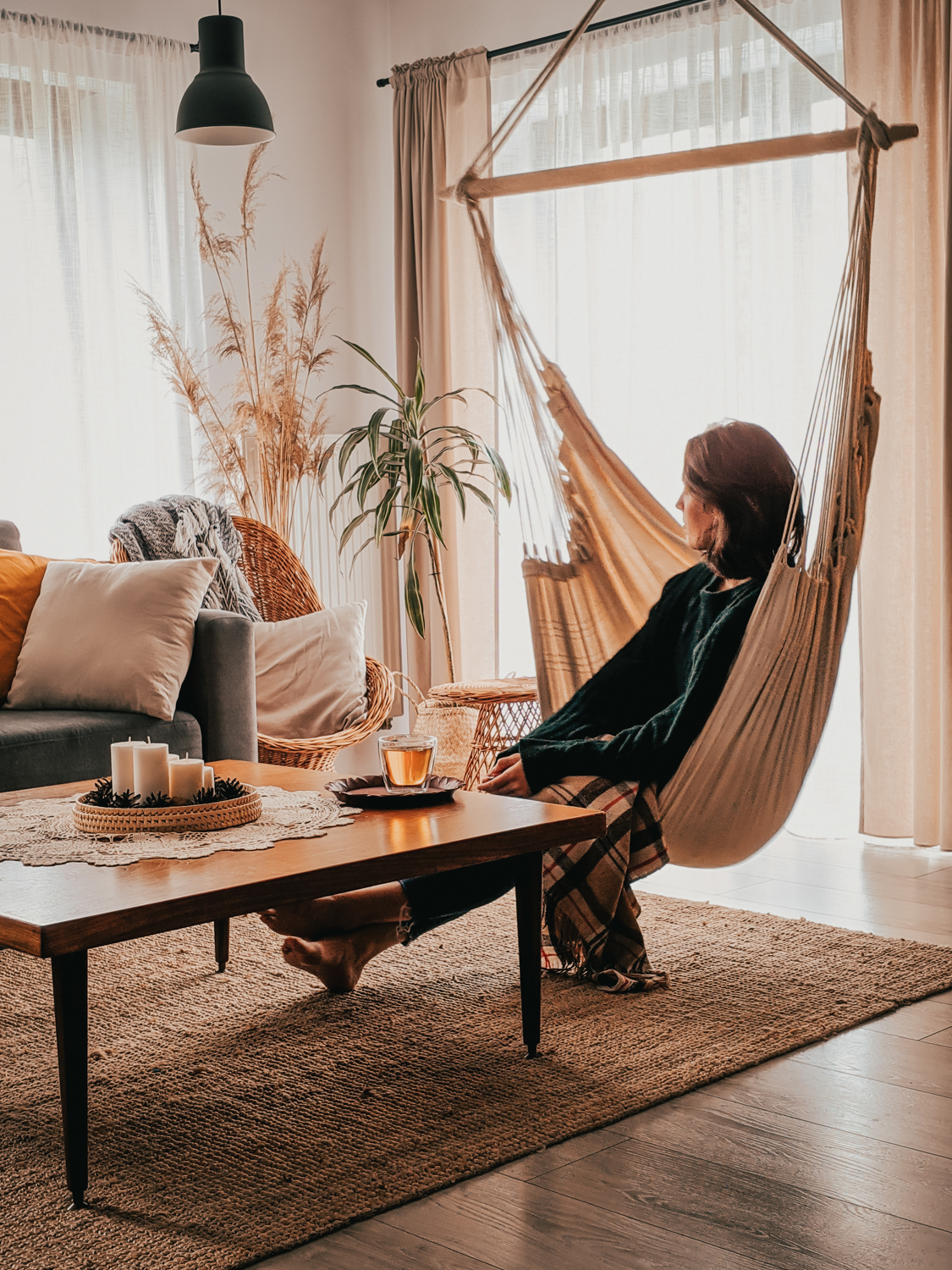 Wir empfehlen diesen Hängesessel in einer Höhe von mindestens 2,1 Meter zu befestigen.