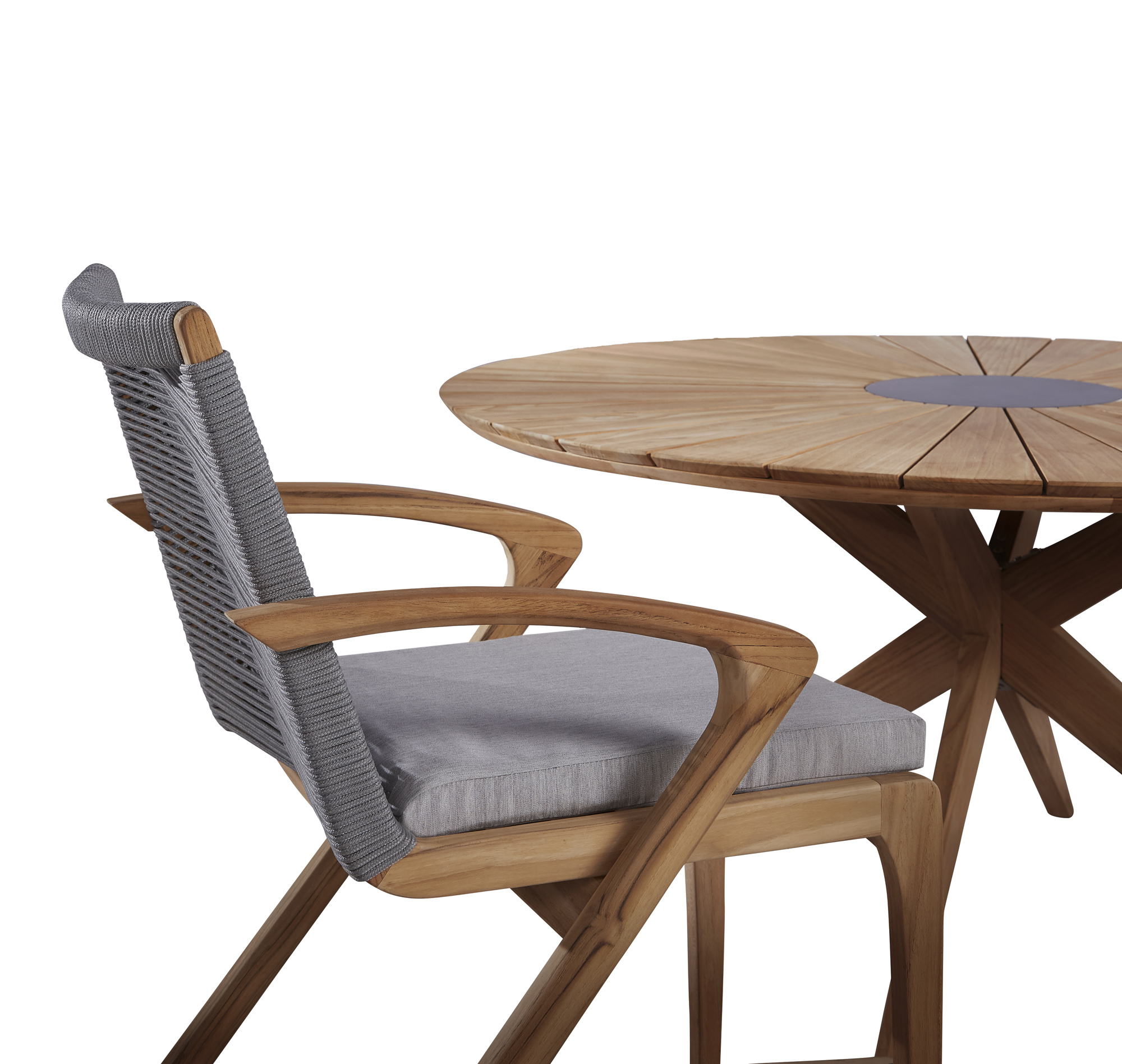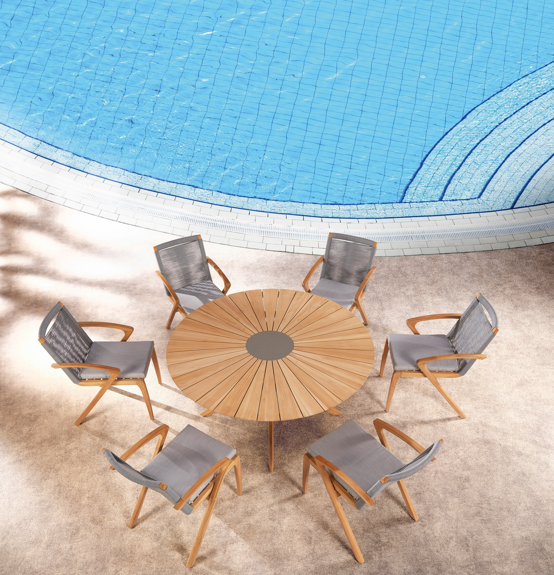 Der Dining-Tisch Agadir kommt in form-vollendetem Design aus erstklassigem, hochwertigem Teakholz. Die Oberflächen werden in einem aufwendigen Verfahren seidenmatt geschliffen und poliert. Durch die individuelle Maserung ist jedes Möbelteil ein Unikat. Die Tischplatte mit eingelassener Betonharzplatte, fächert sich sonnenförmig in abgestimmten Segmenten. Maße: rund 150 cm Ø / Tischhöhe: 74 cm