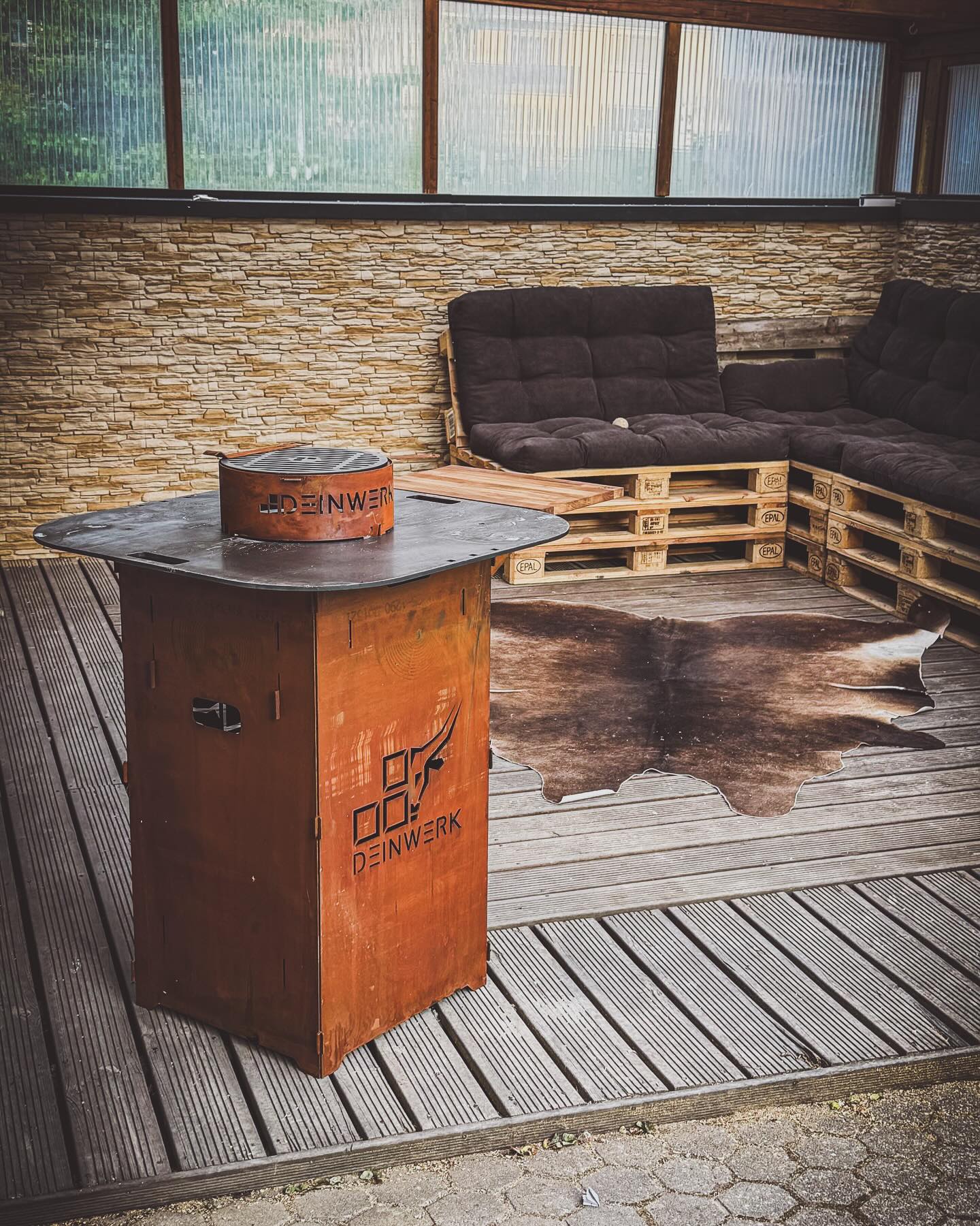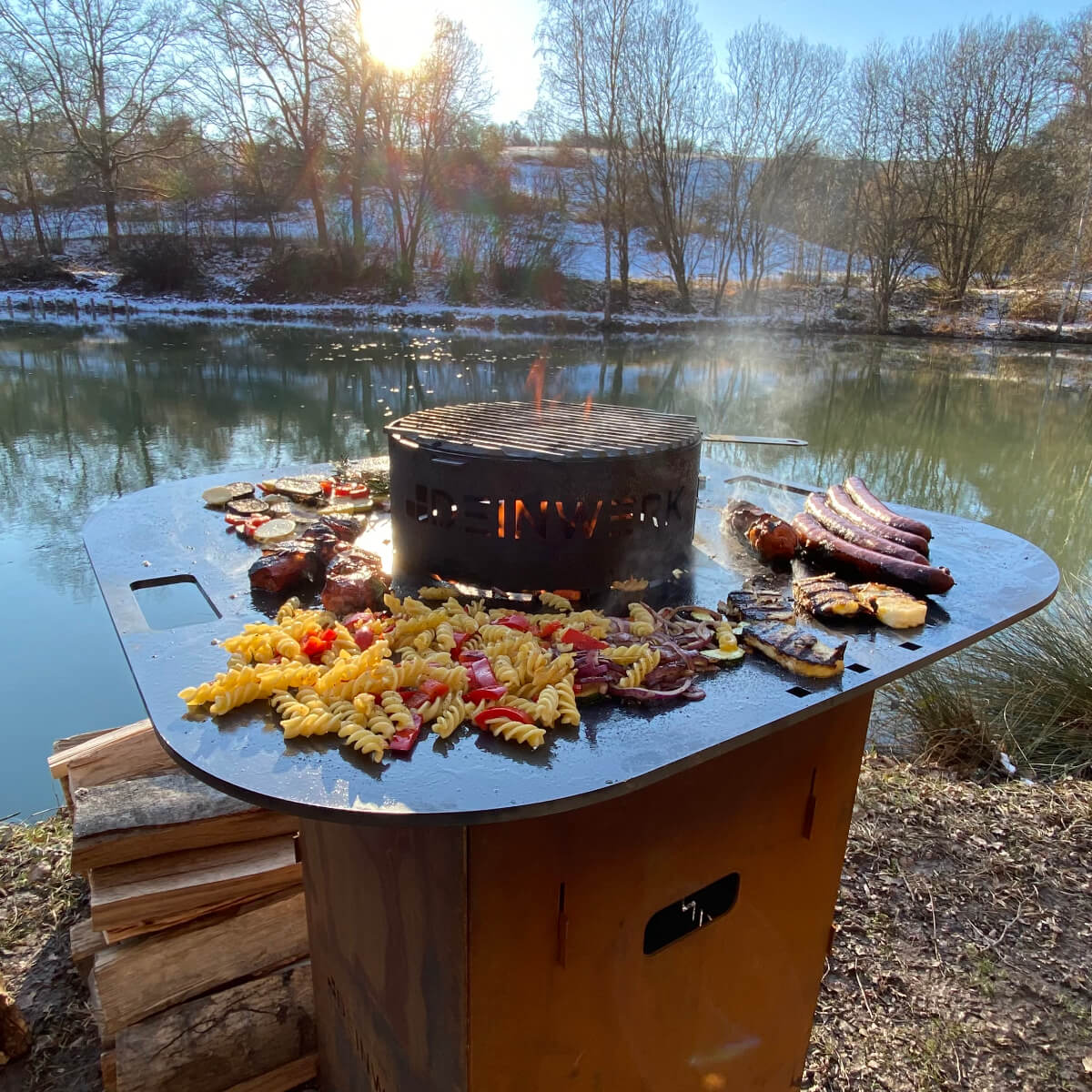 Mulitfunktional! Eine kompakte Outdoor-Küche, die mit wenigen Handgriffen zum Terrassenofen umgebaut werden kann. Unser steckbares Grillfass aus Corten mit Feuerplatte aus 8 mm Stahl, Wokaufsatz, Rost mit Heber und Anstecktisch bietet Grillvergnügen im ganzen Jahr.