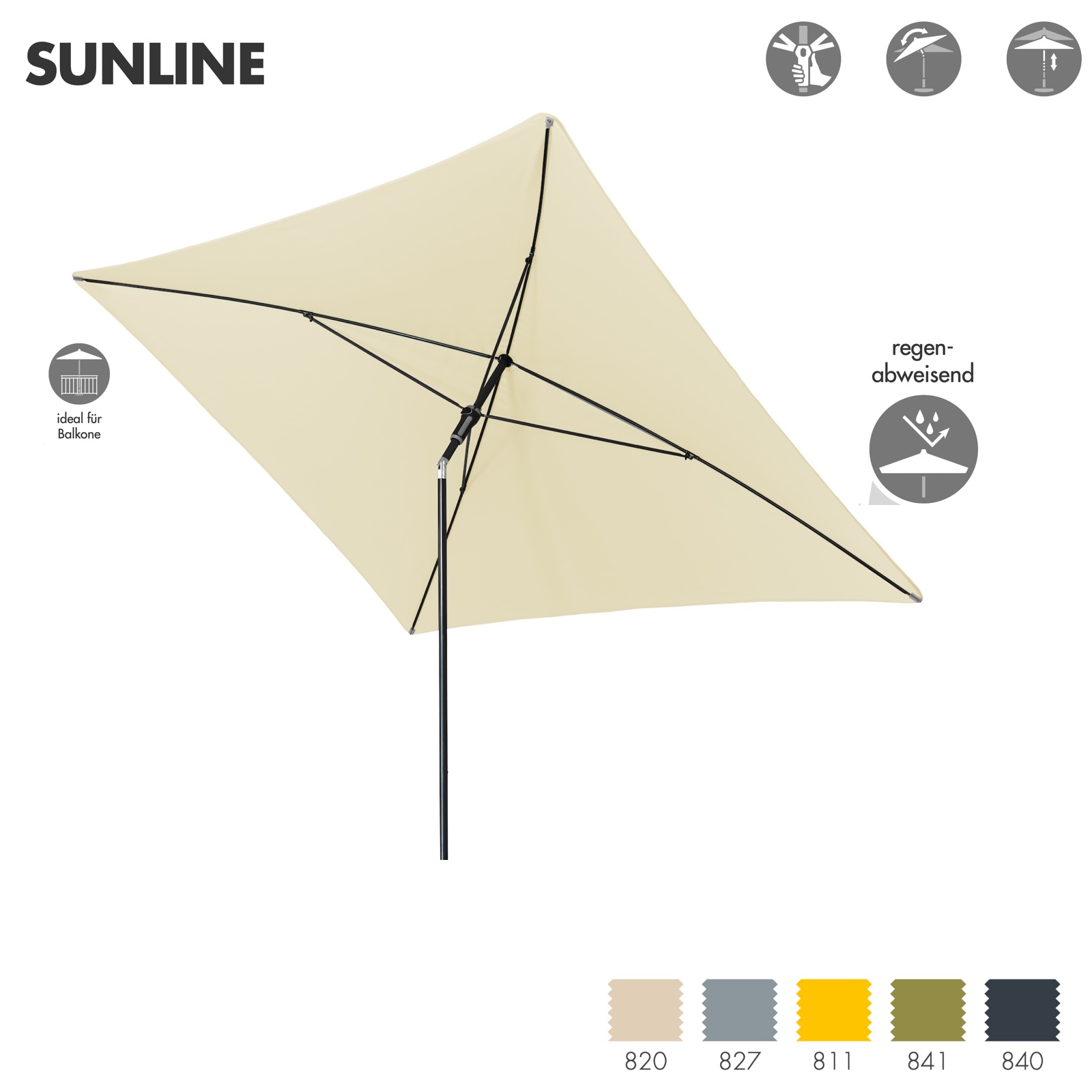 Doppler Sunline Manual Neo Waterproof 230 x 190 cm eckig Sonnenschirm in 5 Farben Mittelmastschirm Balkonschirm