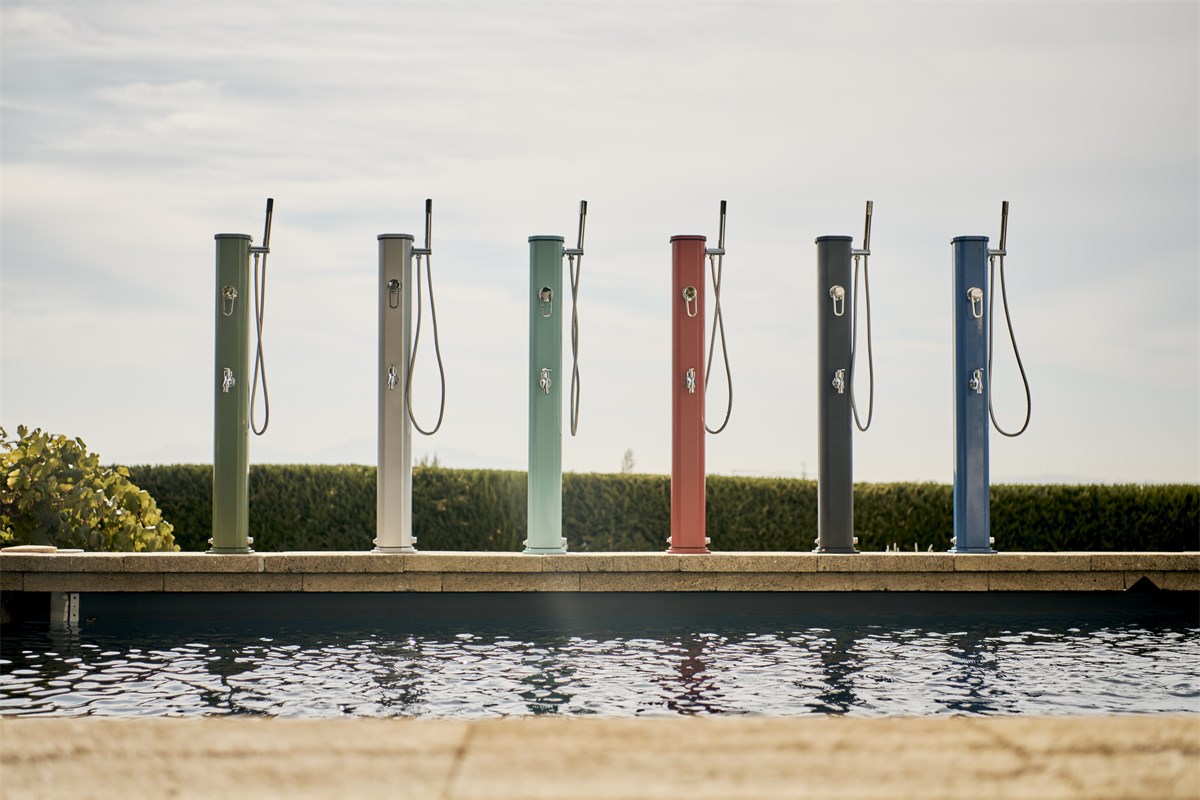 Die mit einem Körper aus pulverbeschichtetem Aluminium gefertigte Dusche Jolly Go ist in zwei Farbtönen erhältlich sowie mit einer Mischbatterie und einer abnehmbaren Handbrause ausgestattet, um sich problemlos den Körper abduschen zu können, ohne die Haare nass zu machen.