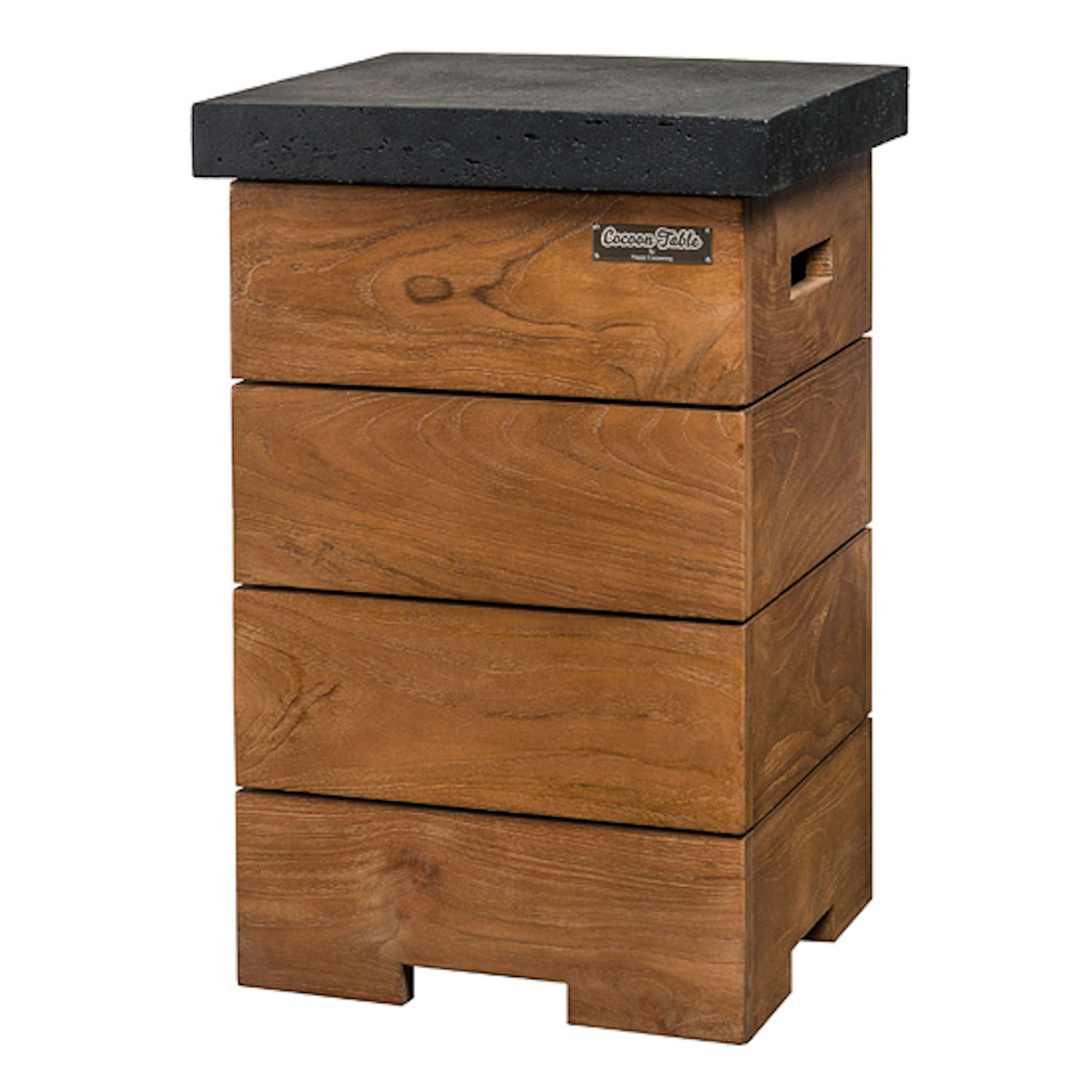 Genießen Sie schöne Stunden zu zweit an einem gemütlichen Feuer ganz ohne das kontinuierliche Nachlegen von Holz oder den teilweise störenden Rauch. Die Feuerstellen von Mania Happy Cocooning sorgen auf Knopfdruck für eine angenehme und behagliche Wohlfühl-Atmosphäre. Die Feuerstellen sind aus hochwertigem Teakholz mit einer Tischplatte aus wetterfestem Verbundstoff in Beton-Optik gefertigt und können das ganze Jahr über draußen stehen. Das praktische Komplettset bietet Ihnen zusätzlich zum Feuertisch ein vielfältiges Zubehörpaket mit schützendem Glasschirm, Deckel für den Feuertisch, zwei Seitentischen und dem Beistelltisch Enclosure, in dem die Gasflasche verstaut werden kann.