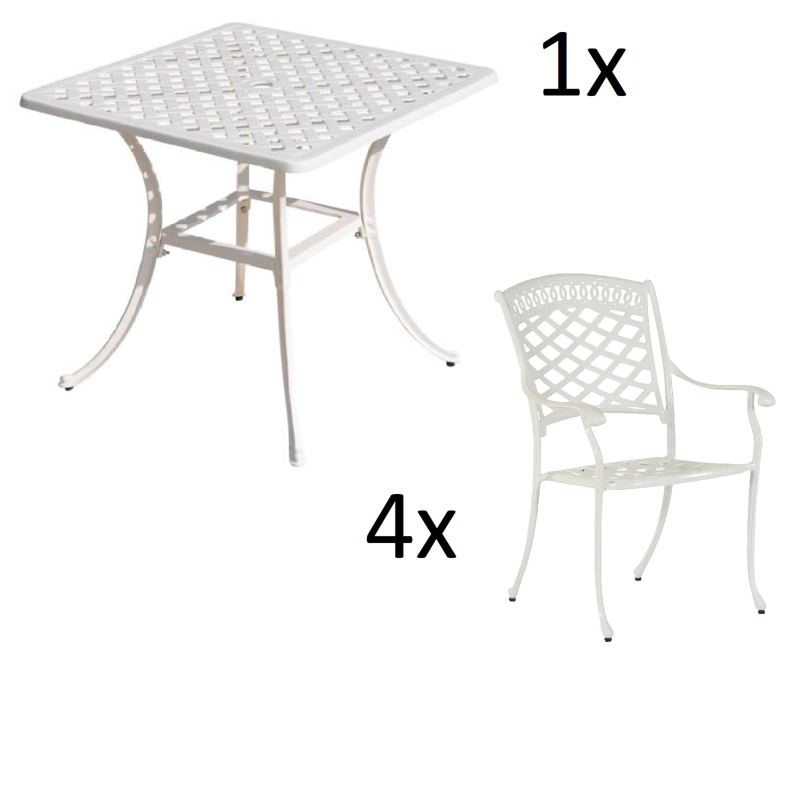 1x Inko Sitzgruppe Alu-Guss weiß bestehend aus 1x Tisch 80x80 cm und 4x dem gewählten Sessel