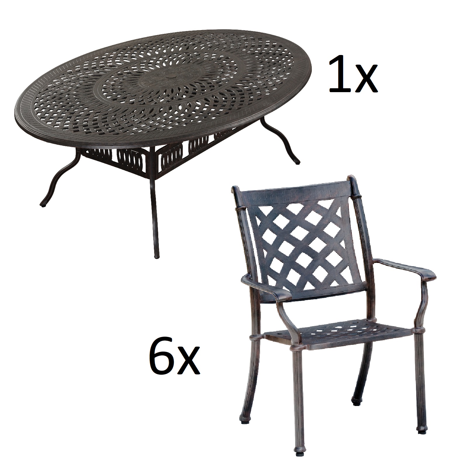 1x Inko Sitzgruppe Alu-Guss bronze bestehend aus 1x Tisch oval 216x152x74 cm und 6x dem gewählten Sessel