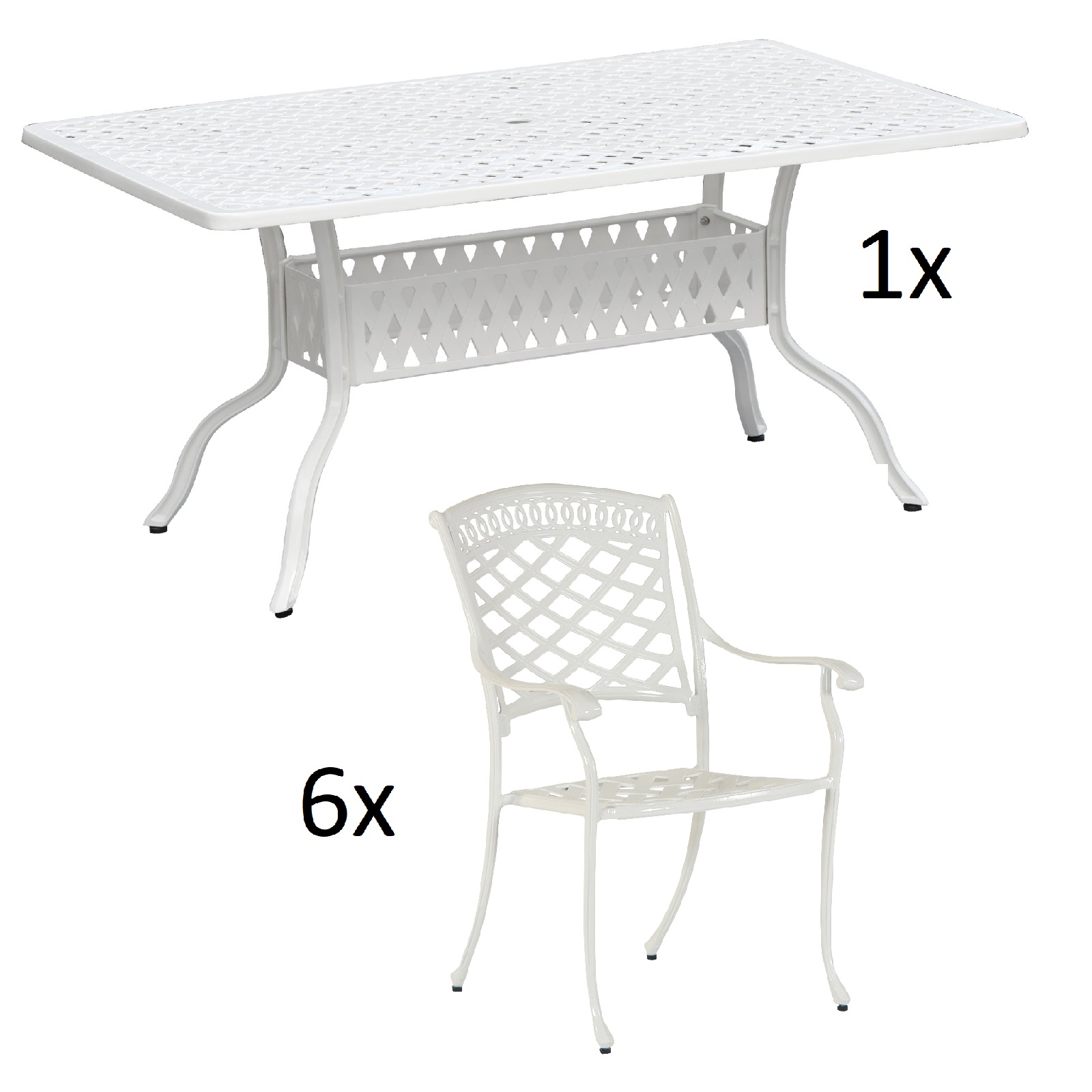 1x Inko Sitzgruppe Alu-Guss weiß bestehend aus 1x Tisch 120x80x74 cm und 6x dem gewählten Sessel
