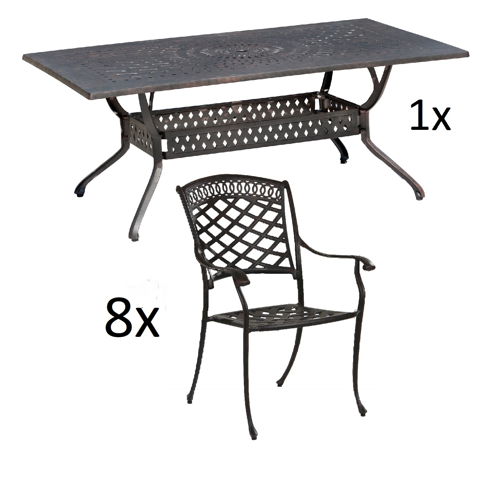 1x Inko Sitzgruppe Alu-Guss bronze bestehend aus 1x Tisch 215x107x74 cm und 8x dem gewählten Sessel