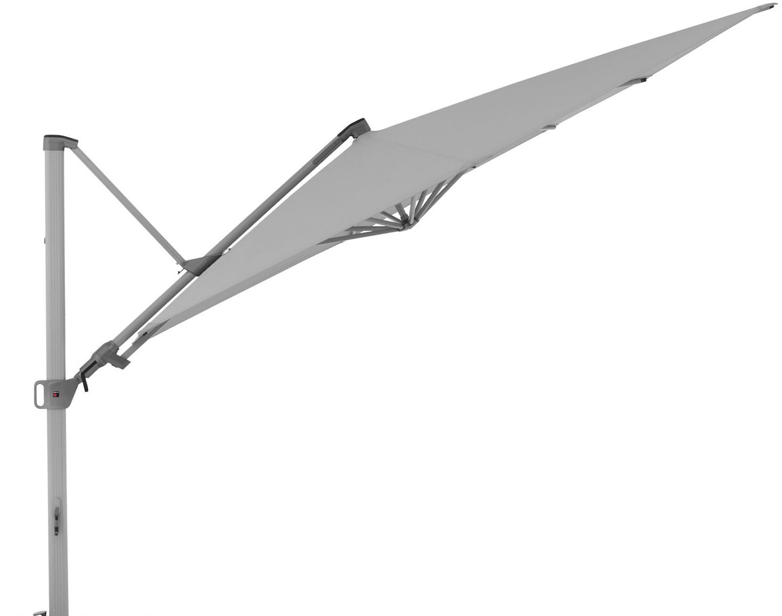 Das massive witterungsbeständige Gestell aus Aluminium verleiht dem Sonnenschirm eine zeitlose Erscheinung. Durch den Schiebegriff und die leichtgängige Kurbel lässt sich der Schirm ohne viel Kraftaufwand aufspannen.