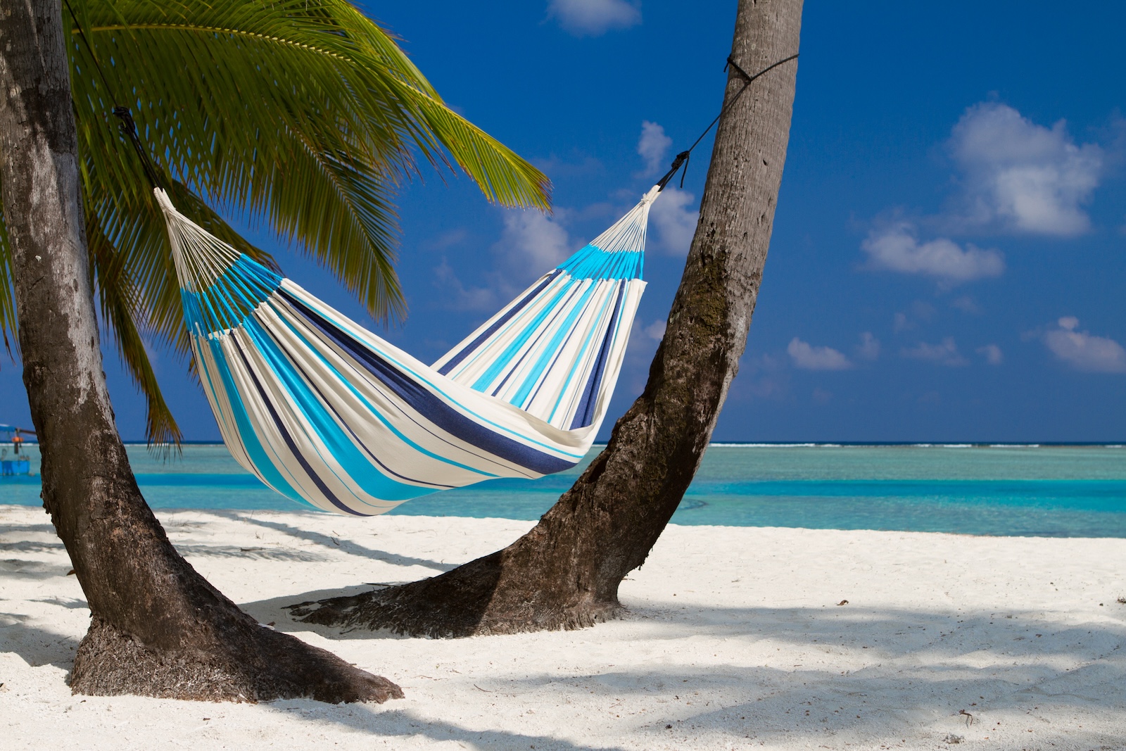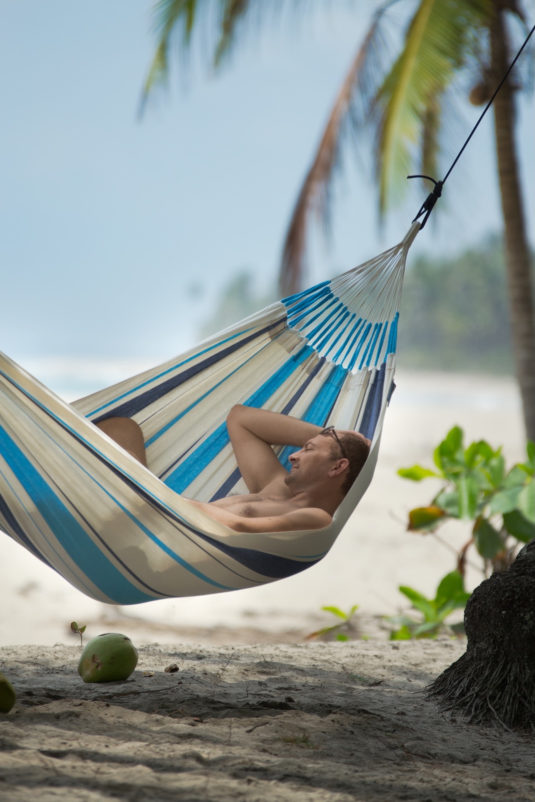 Traditionelle Tuchhängematte für eine Person. Tipp: Am bequemsten liegt man möglichst quer darin – so wird der Rücken am besten unterstützt und die Hängematte wird vom Körper geöffnet.