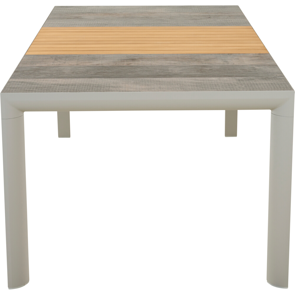 Die rechteckige Tischplatte aus Keramik in washed grau und einer Tischplatten-Einlage in Teak ist besonders robust, kratzfest sowie hitze- und witterungsbeständig – ideal für den täglichen Einsatz im Außenbereich. Das stabile Gestell aus pulverbeschichtetem Aluminium in seidengrau sorgt für eine hohe Standfestigkeit und Langlebigkeit.