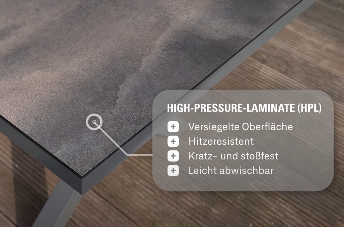 Die Tischplatte besteht aus einer HPL-Platte in titan und ist somit extrem Wetterfest. Durch ihre Resistenz gegenüber Abnutzungen, Kratzern, Feuchtigkeit und Hitze ist sie langlebig. Selbst Witterungen wie Frost und Hitze machen der Tischplatte nichts aus.