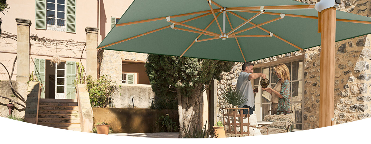 Der GLATZ AURA beeindruckt mit einem würdevollen Mast aus mehrfach lackiertem, warmem Eukalyptusholz, der durch einen stabilen Aluminiumkern verstärkt ist. Edle, pulverbeschichtete Edelstahleinsätze in silbernen Tönen runden das hochwertige Erscheinungsbild ab. Kombiniert mit einem Schirmbezug aus Stoffqualität 5 entsteht ein Seitenmastschirm, der durch seine erlesenen Materialien und das authentische Design natürliche Magie und hinreißende Eleganz ausstrahlt.Trotz seiner beeindruckenden Größe bleibt der AURA beweglich und flexibel: Das prachtvolle Schirmdach lässt sich je nach Sonnenstand zum Mast hin neigen und stufenweise um 360° drehen – ganz einfach per Arretierhebel. Mit wenigen Kurbelumdrehungen öffnen oder schließen Sie den Schirm mühelos. Dabei sorgt der unverrückbare Sockel auch bei hoher Windstärke für einen sicheren und stabilen Stand.