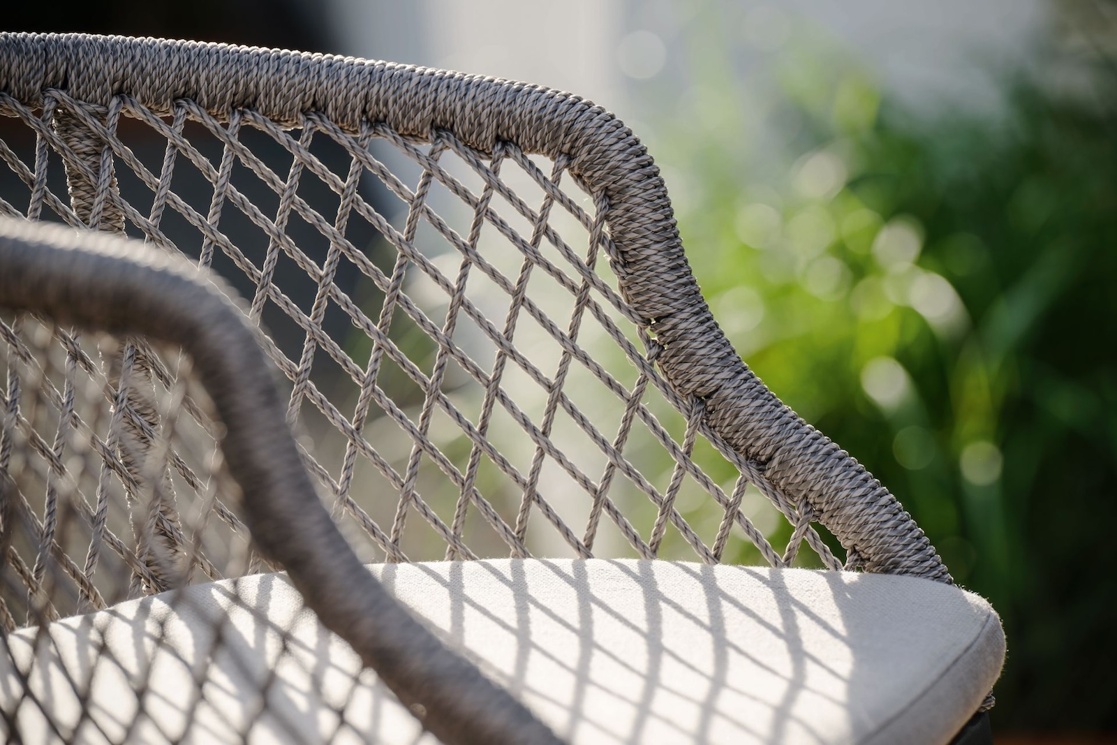 Die Rückenfläche aus hochwertiger Kordel im Farbton salt verleiht dem Barsessel eine luftige, handwerkliche Note und unterstützt gleichzeitig ergonomisches Sitzen. Für maximalen Komfort sorgt das weiche Sitzkissen aus 100 % Polyacryl im Farbton cream, das nicht nur angenehm sitzt, sondern auch pflegeleicht und bei 30 °C waschbar ist.