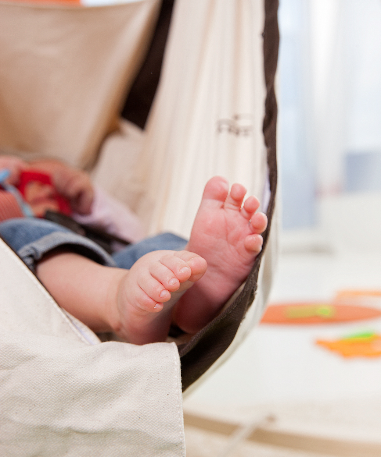 Neugeborene, sehr kleine Babies oder Frühchen fühlen sich besonders wohl, wenn man die Kangoo am Fußende mit den Holzverschlüssen eng einstellt. Ein paar Monate später sorgt das Öffnen der Holzknöpfe für etwas mehr Platz. Ältere und größere Babies haben es dann mit komplett offenem Fußende schön luftig und eine bessere Sicht auf die Außenwelt.