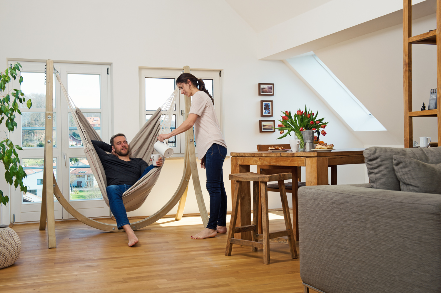 Der XL Hängesessel Artista Sand von Amazonas wird in Brasilien per Handarbeit zu fairen Bedingungen produziert und verbreitet schon allein beim Anblick südamerikanische, sonnige Stimmung.