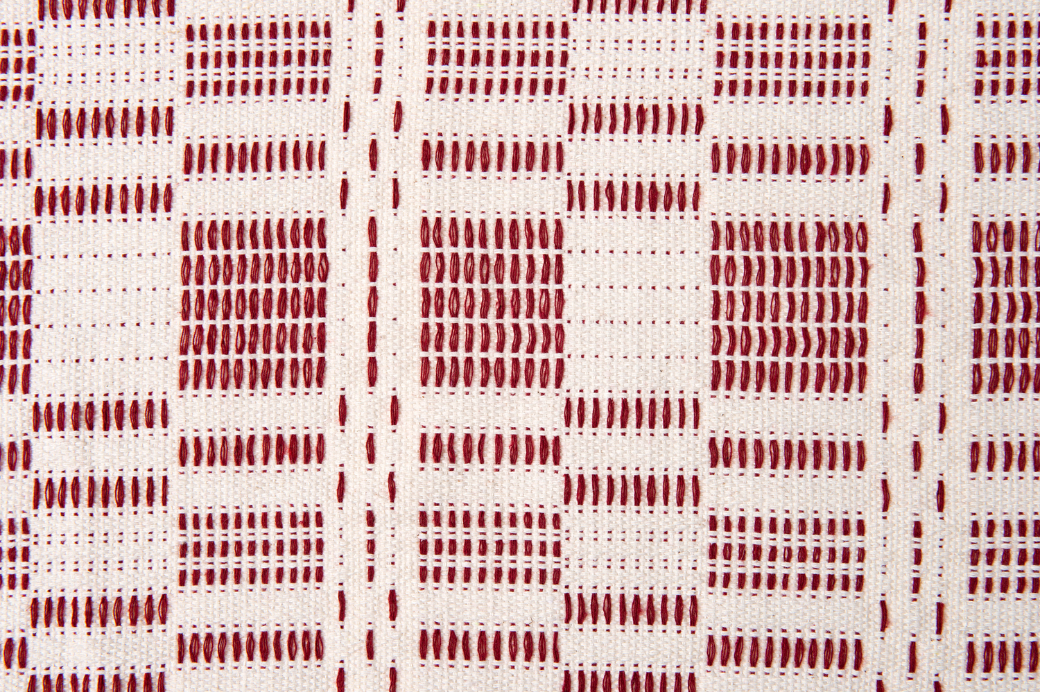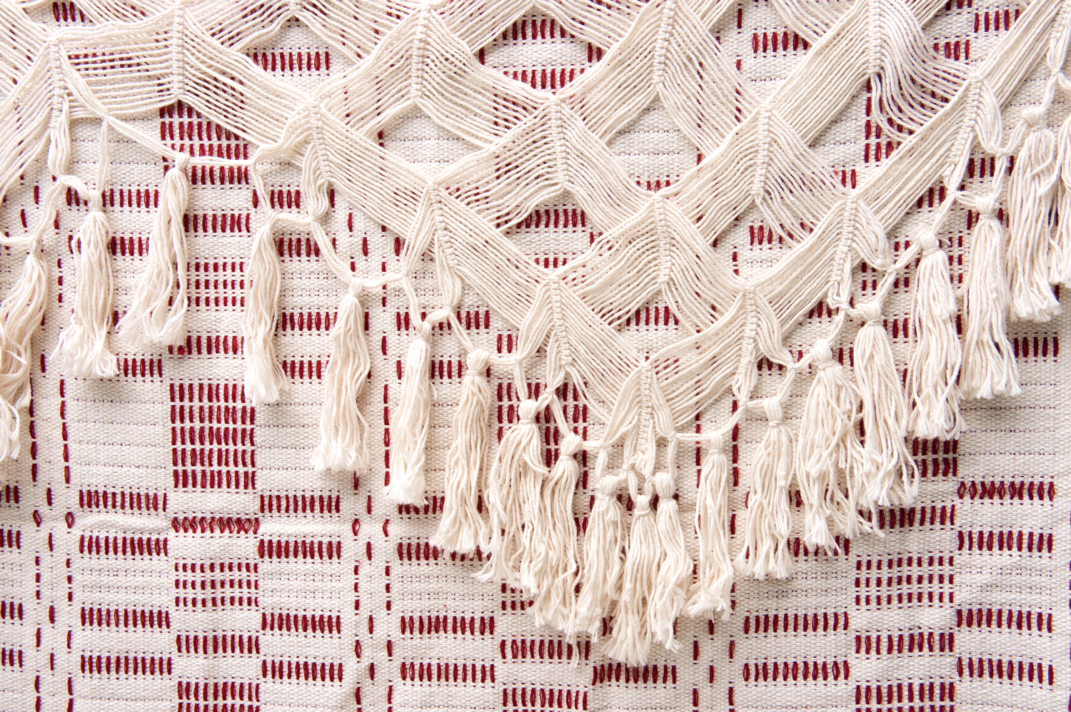 - Handgewebtes Baumwollband, welches in die Aufhängeschnüre eingearbeitet wird