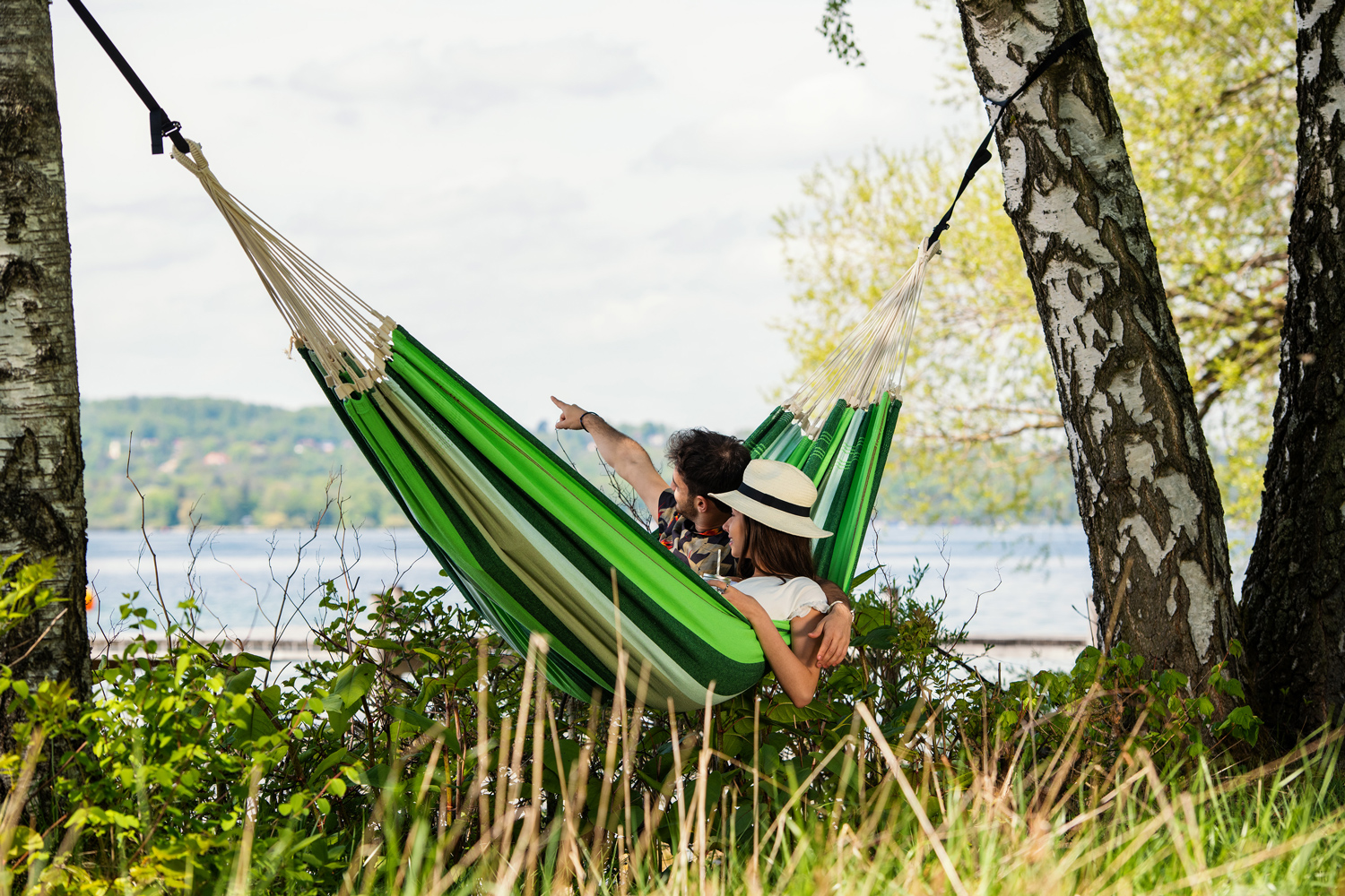 Die brasilianische XXL Hängematte Paradiso von Amazonas wird in Brasilien per Handarbeit zu fairen Bedingungen produziert und verbreitet schon allein beim Anblick südamerikanische, sonnige Stimmung. Diese Tuchhängematte aus recycelter Baumwolle ist sehr beliebt, da der Stoff fest gewebt, robust und trotzdem extrem weich und anschmiegsam ist - für maximalen Liegekomfort. Das sorgt für Entspannung und kuschelige Wohlfühlatmosphäre in der Hängematte.