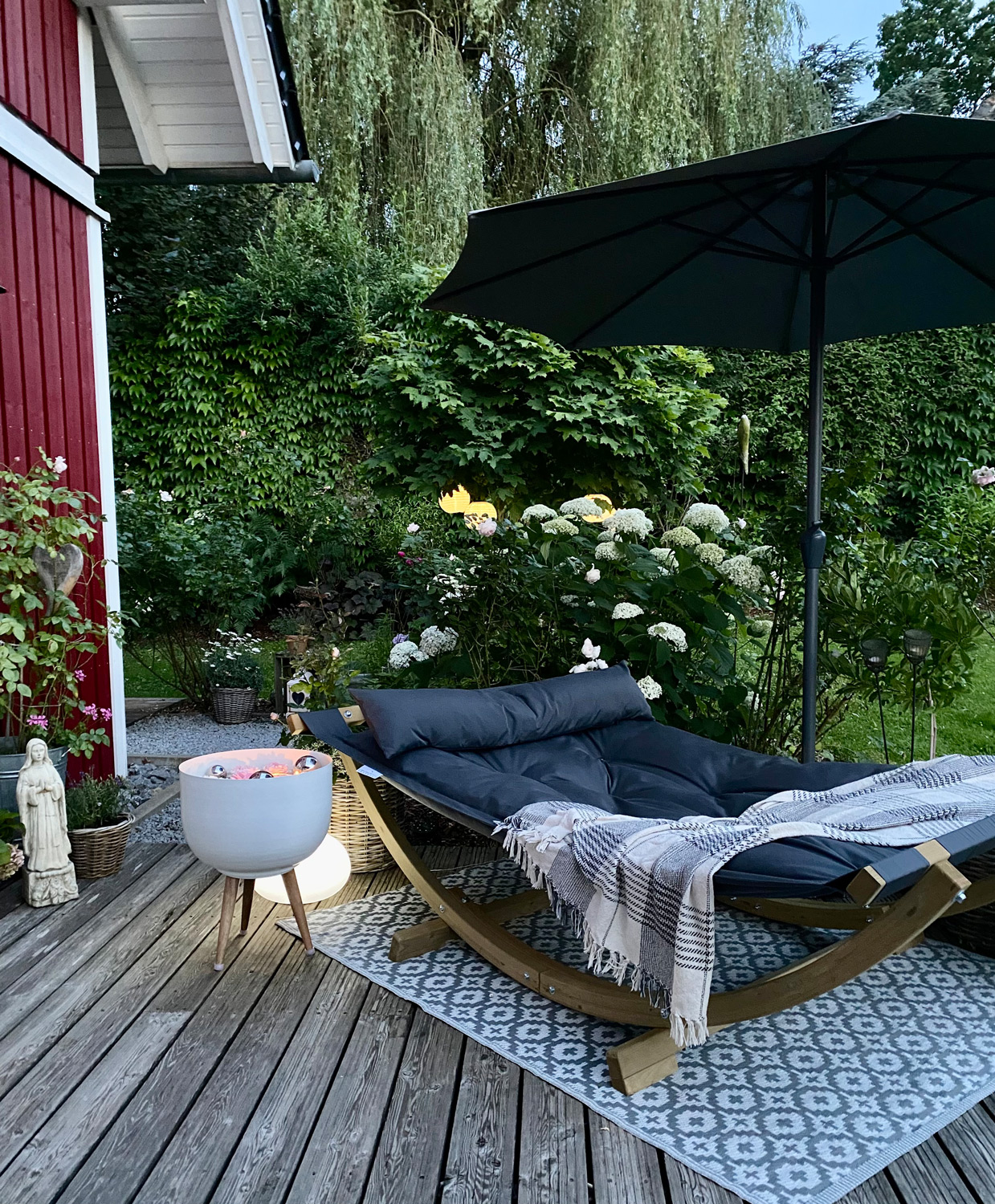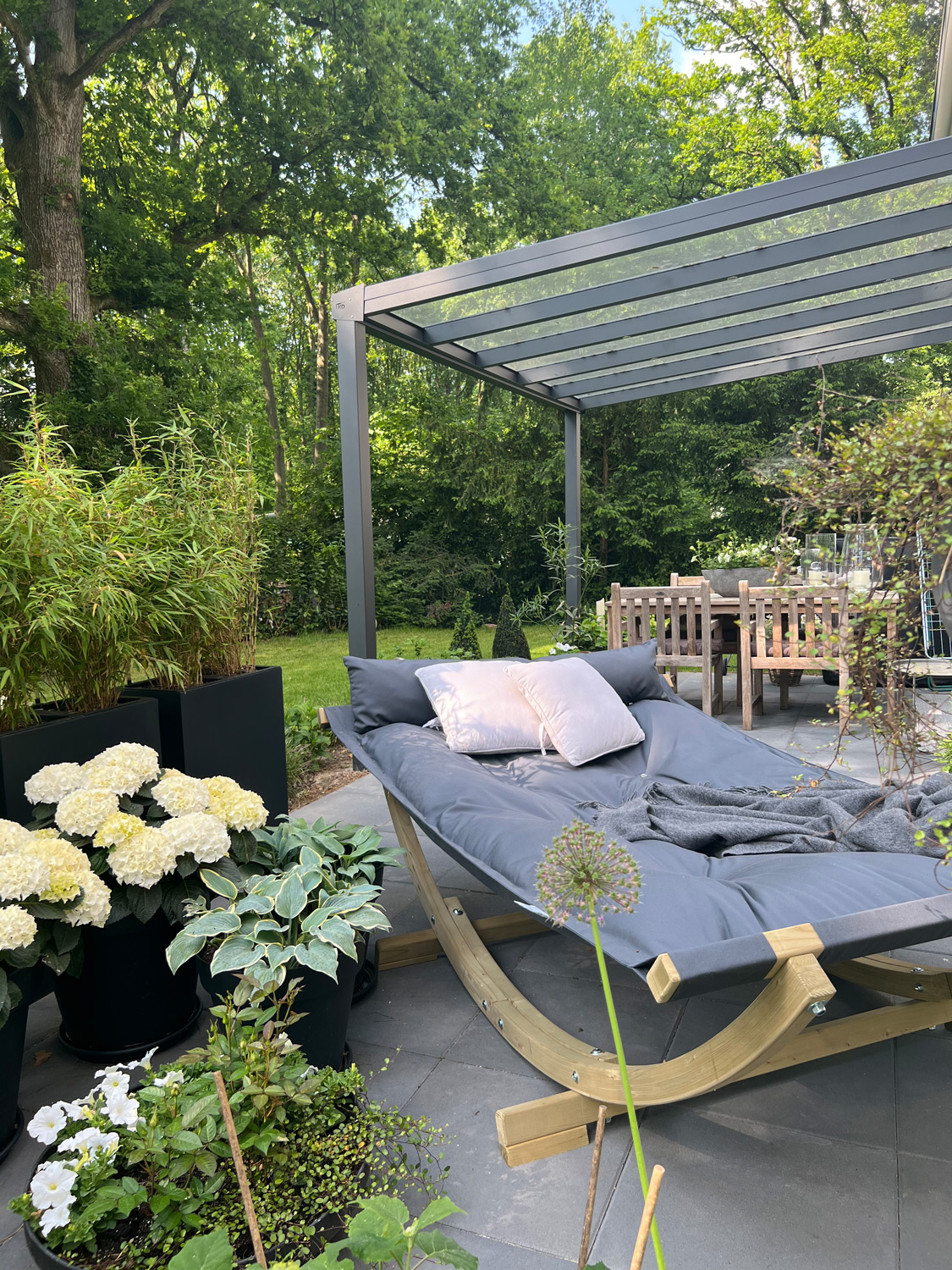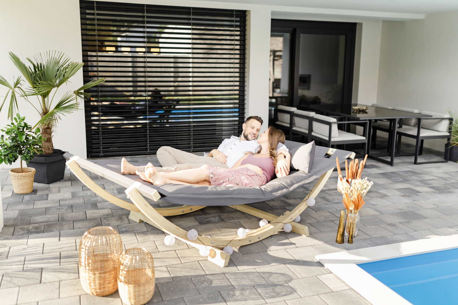 Besonders dick gefütterte Luxusliege für den Garten oder stylisches Open-Air Sofa für Ihre Terrasse mit höchstem Liegekomfort. Es ist so groß, dass man darauf nicht nur allein, sondern auch zu zweit wunderbar relaxen oder sogar ein Mittagsschläfchen im Garten machen kann. Breite Aufhängepunkte an beiden Enden gleichen punktuelle Belastungen aus und sorgen für Stabilität.
