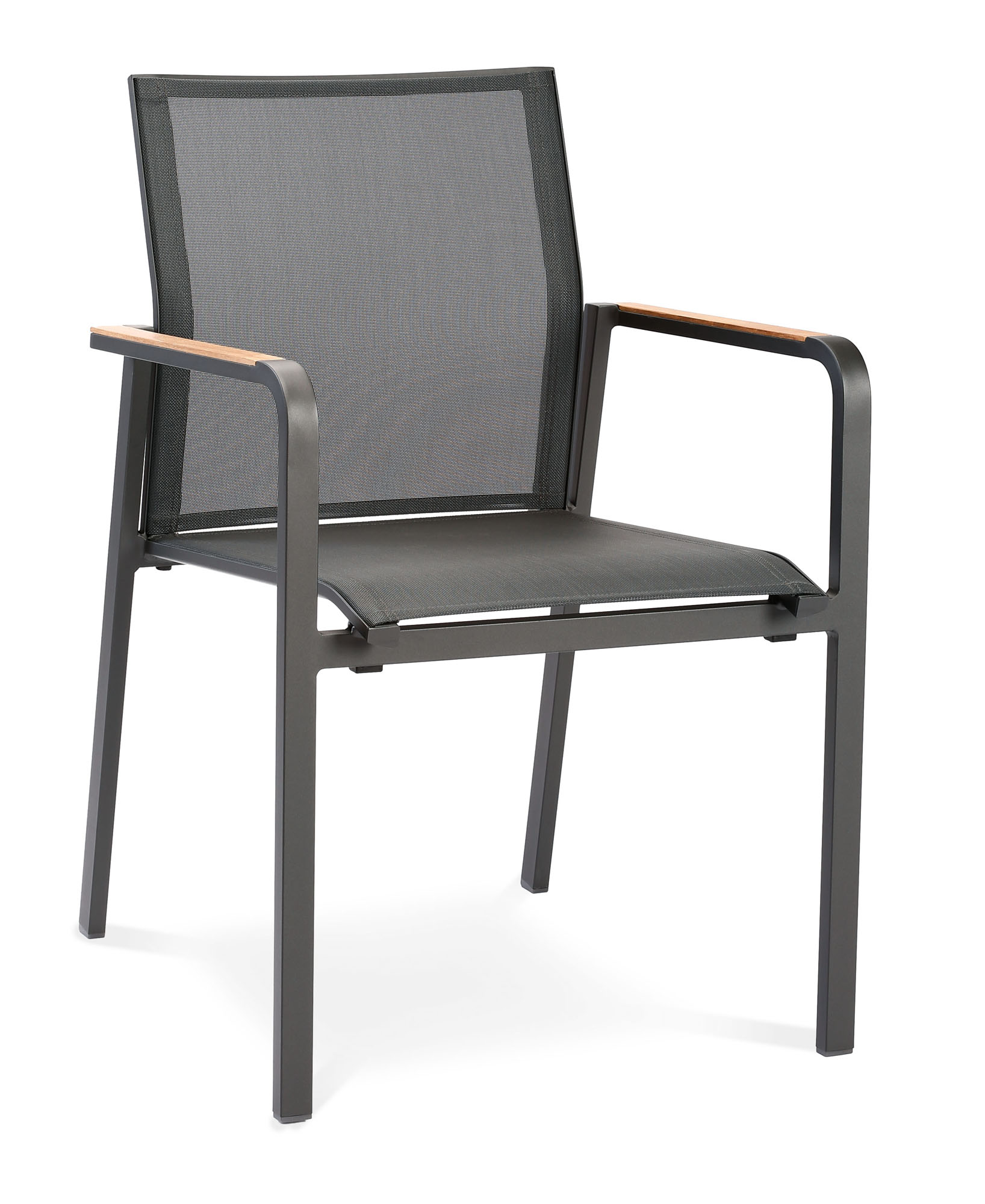 7-tlg. Tischgruppe Paros anthrazit, bestehend aus: 6x Stapelsessel + 1x Tisch. Moderne Dining-Gruppe mit einem Gestell aus rostfreiem Aluminium. Daher leicht und unkompliziert im Handling mit einer strapazierfähigen Oberflächenbespannung aus witterungsbeständigem Ergotex. Der ergonomische Knick der Rückenlehne ergibt ein sehr bequemes Sitzgefühl. Die Sessel sind platzsparend stapelbar und hervorragend für den Objektbereich geeignet. Die Armlehnenaufsätze und die Tischleisten sind aus hochwertigem, angenehmem Teakholz angefertigt. Durch ein spezielles Verfahren erhält das Teakholz eine witterungsbeständige und einzigartige Patina. Diese verleiht den Möbeln einen ganz besonderen Charme.