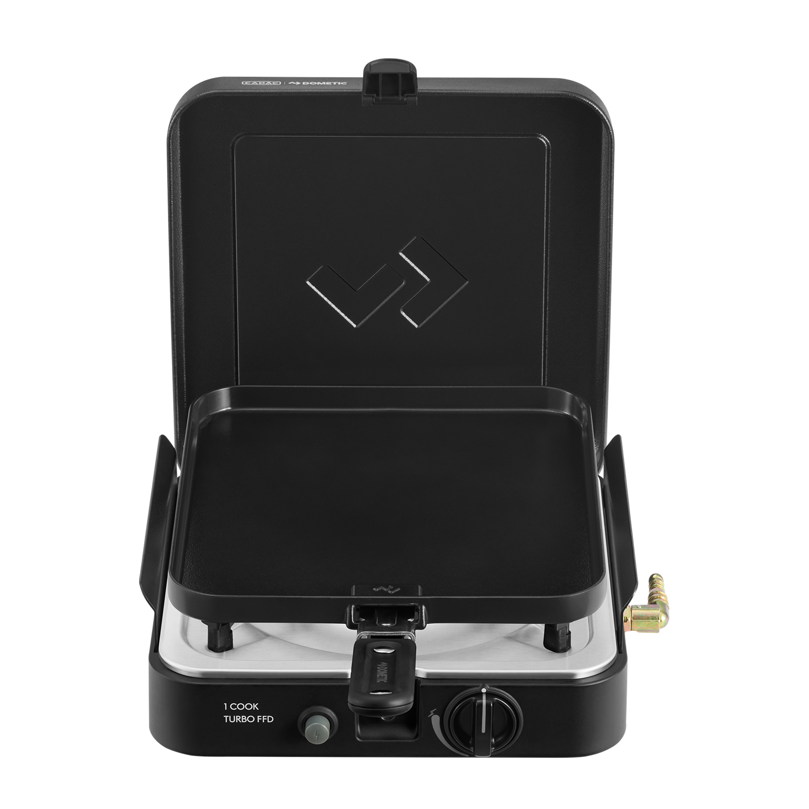 Der Cadac 1-Cook Turbo FFD mit glatter Grillplatte ist mit einem 2,2 kW Turbo Brenner ausgestattet, der tief im Gerät verbaut und so weniger empfindlich gegenüber Wind ist. Das führt zu einer stärkeren Wärmeabgabe, was die Kochzeit und den Gasverbrauch wesentlich reduzieren kann. Als zusätzlicher Schutz vor Wind dienen die beiden seitlichen, abnehmbaren Windbleche.