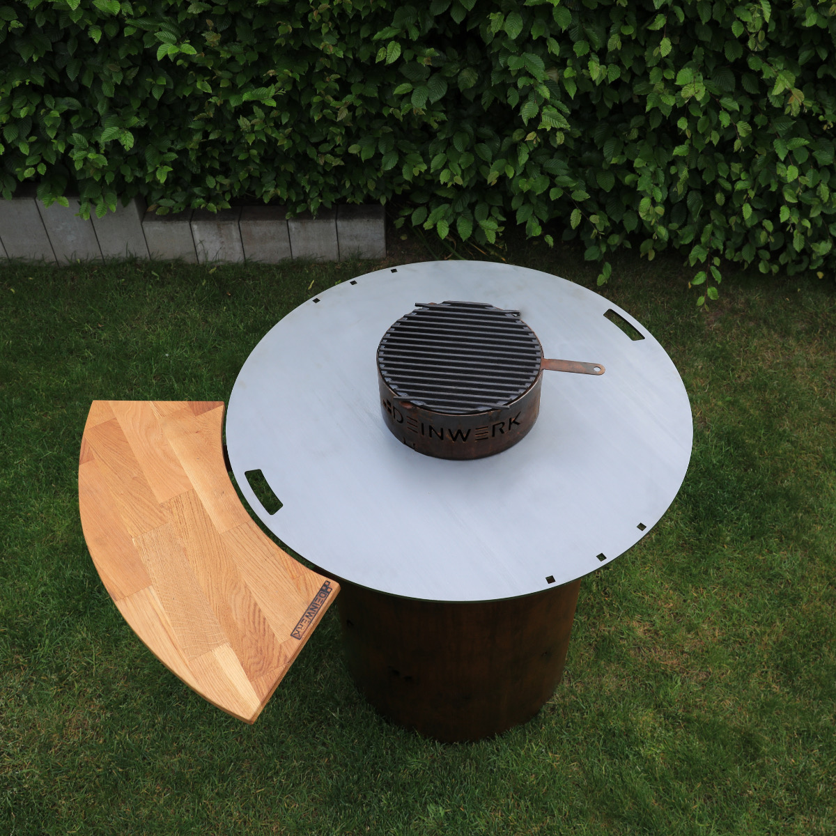 Eigenschaften "DEINWERK Grillfass-Set Grilltonne aus Corten mit Plancha, Grillrost, Wok-Aufsatz und Anstecktisch"
