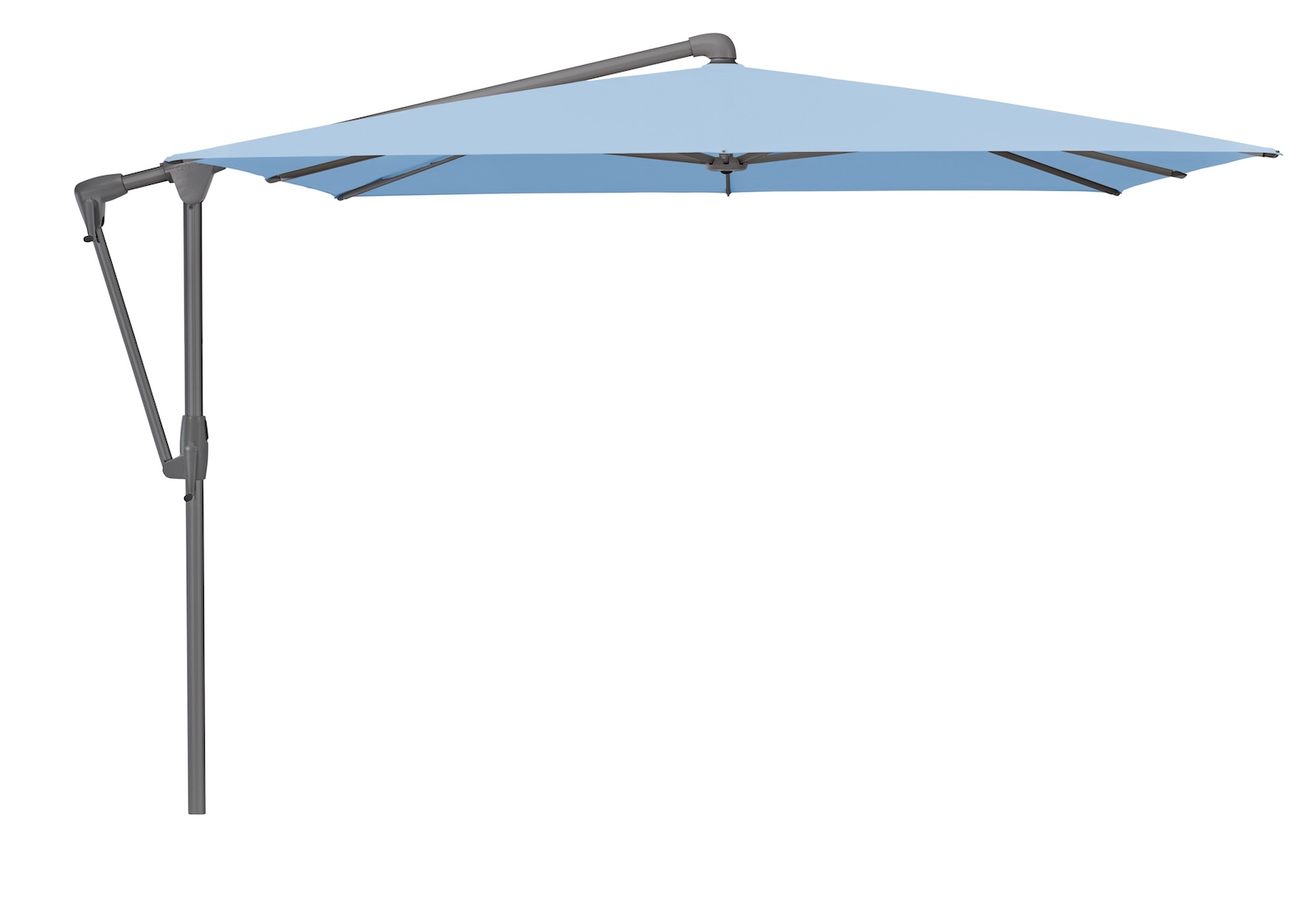 Das Schirmdach lässt sich mittels selbstarretierender Kurbel kinderleicht bedienen und bis zu 45º beidseitig schräg stellen sowie 360º um den eigenen Mast drehen.