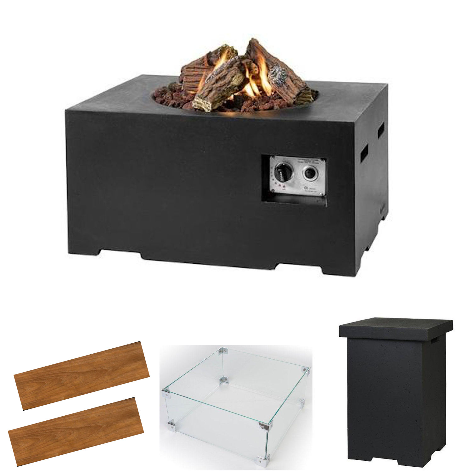 Genießen Sie schöne Stunden zu zweit an einem gemütlichen Feuer ganz ohne das kontinuierliche Nachlegen von Holz oder den teilweise störenden Rauch. Die Feuerstellen von Mania Happy Cocooning sorgen auf Knopfdruck für eine angenehme und behagliche Wohlfühl-Atmosphäre. Die Feuerstellen sind aus wetterfestem Verbundstoff in Beton-Optik gefertigt und können das ganze Jahr über draußen stehen. Das praktische Komplettset bietet Ihnen zusätzlich zum Feuertisch ein vielfältiges Zubehörpaket mit schützendem Glasschirm, zwei Seitentischen und dem Beistelltisch Enclosure, in dem die Gasflasche verstaut werden kann.