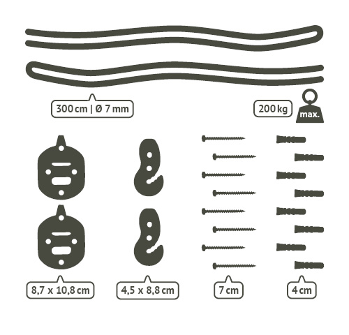 - Inhalt: 2 Seile, 2x SmartHook, 2x MultiSpot, 8 Schrauben und 8 Dübel