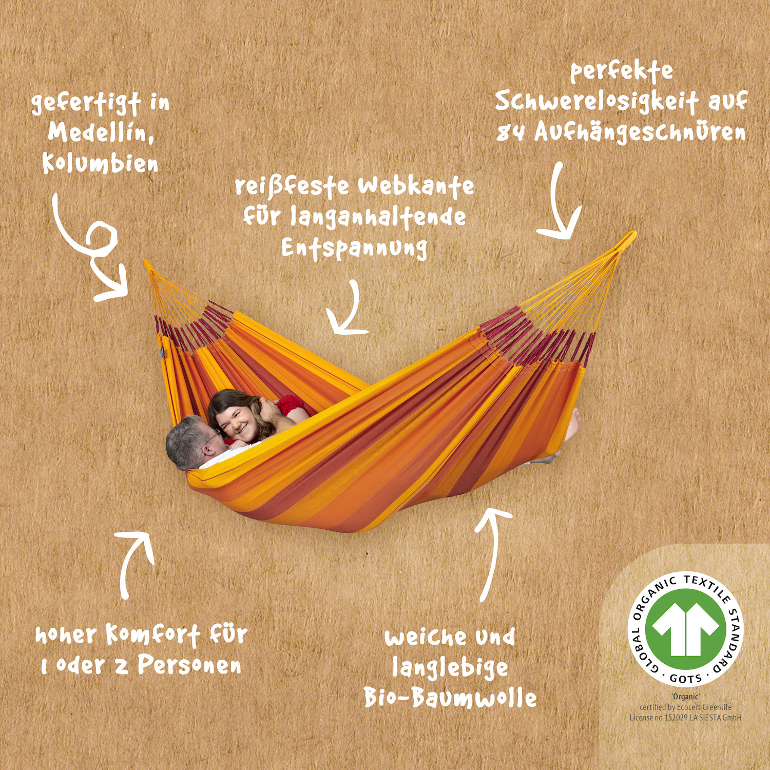 Eigenschaften "La Siesta Hängematte MODESTA volcano orange aus Bio-Baumwolle Doppelhängematte"