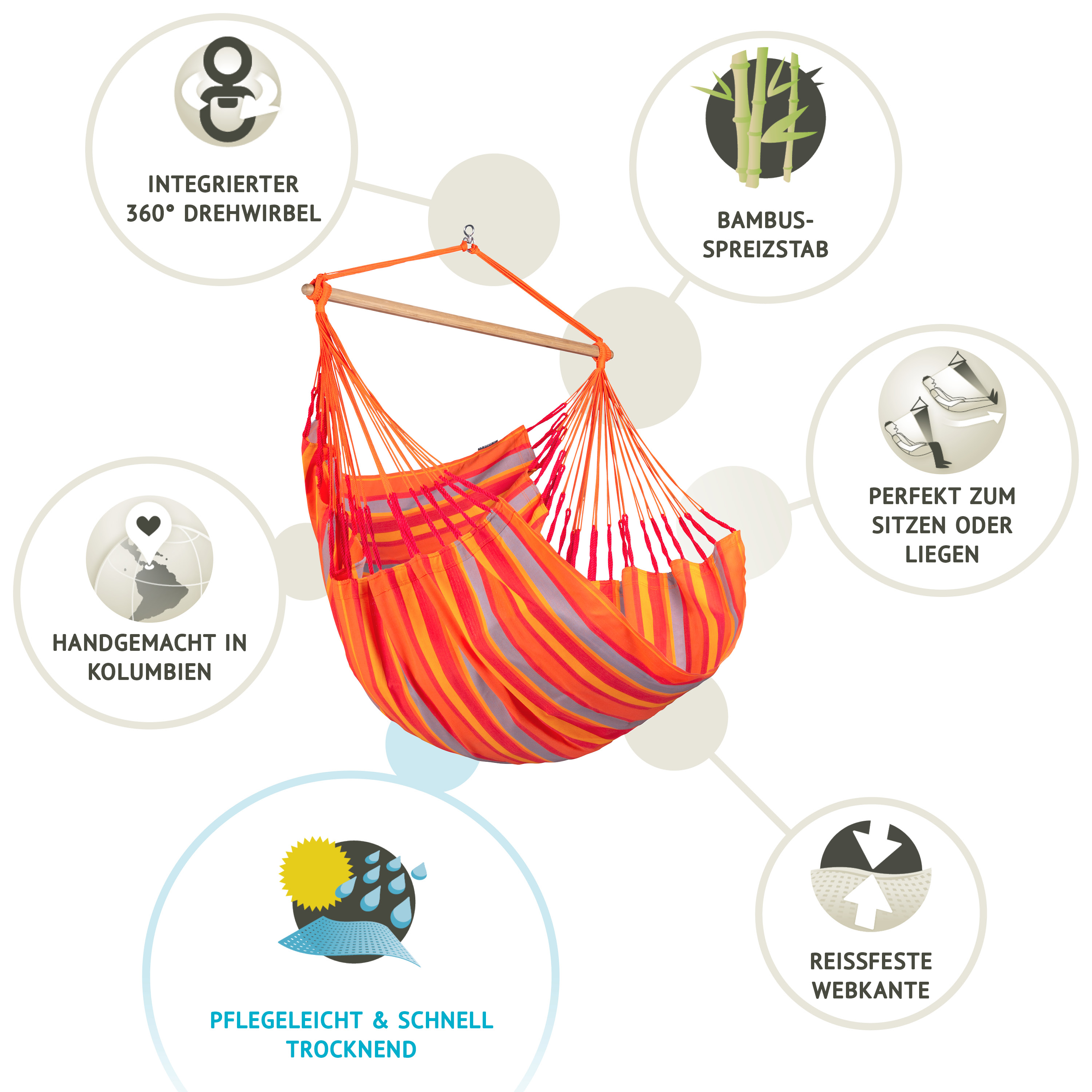 Er bietet hohen Liegekomfort und ist durch seine Wetterbeständigkeit besonders für den Gebrauch in der freien Natur geeignet. Der Hängestuhl ist aus HamacTex hergestellt, einer speziell für Hängesessel entwickelten Polypropylen-Faser. Diese ähnelt der Baumwolle, ist jedoch wetterbeständiger und trocknet schneller. Durch verstärkte Webkanten ist er besonders reißfest. Der Spreizstab ist aus hochwertigem Bambusholz hergestellt und setzt ein optisches Highlight.