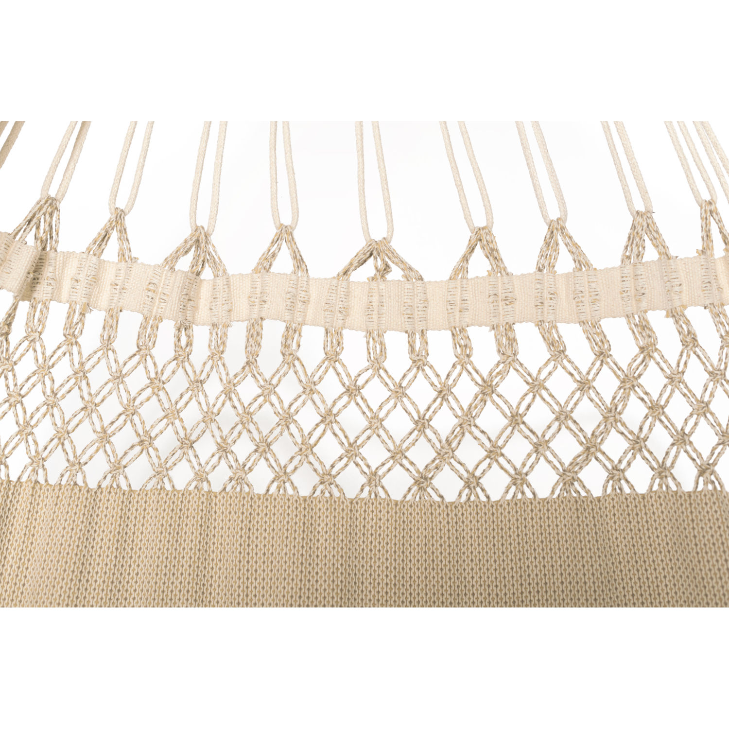 Sie bietet hohen Liegekomfort und ist durch ihre exklusiven Zierborten und das Macramé zwischen Tuch und den Aufhängeschnüren ein besonderer Hingucker. Sie ist aus hochwertiger Bio-Baumwolle gefertigt, was für ein angenehmes Hautgefühl sorgt und die Hängematte besonders pflegeleicht macht. Durch verstärkte Webkanten ist sie besonders reißfest.