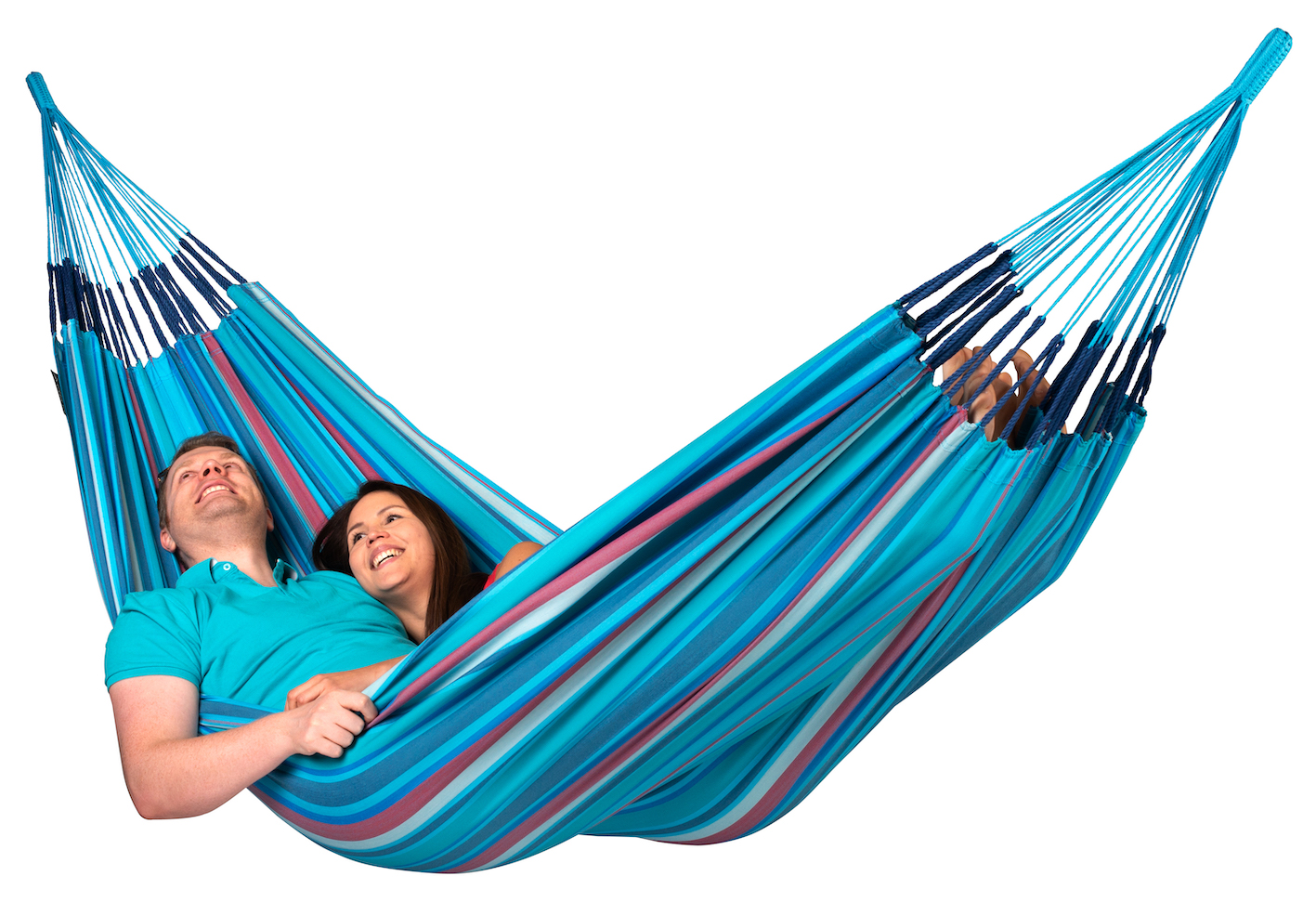 Die wetterfeste Kingsize-Hängematte BRISA von La Siesta lädt zum gemeinsamen Entspannen ein.