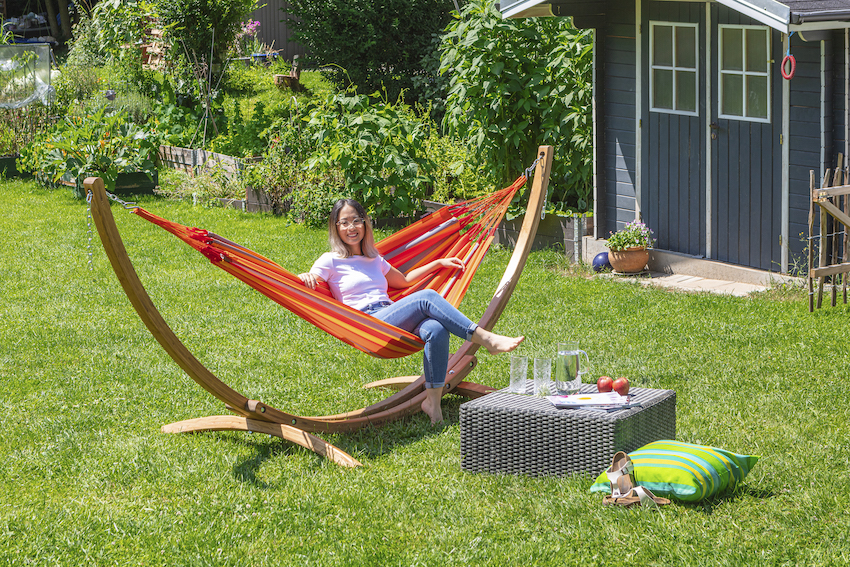 Die wetterfeste Single-Hängematte BRISA von La Siesta lädt zum Entspannen ein.