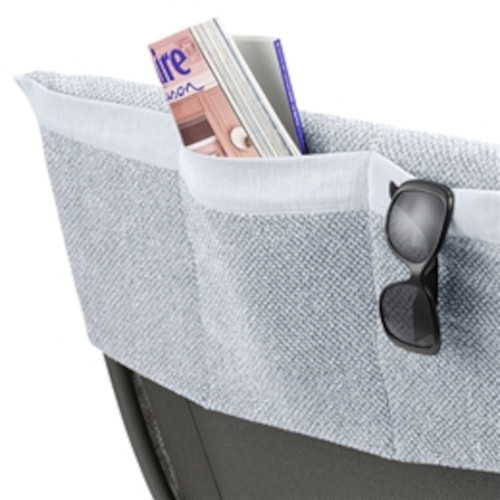 Die Auflage wird über das Kopfteil der Liege befestigt und ist auf der Rückseite mit drei praktischen Fächern zum Aufbewahren von Büchern, Getränken oder anderen Kleinutensilien ausgestattet.