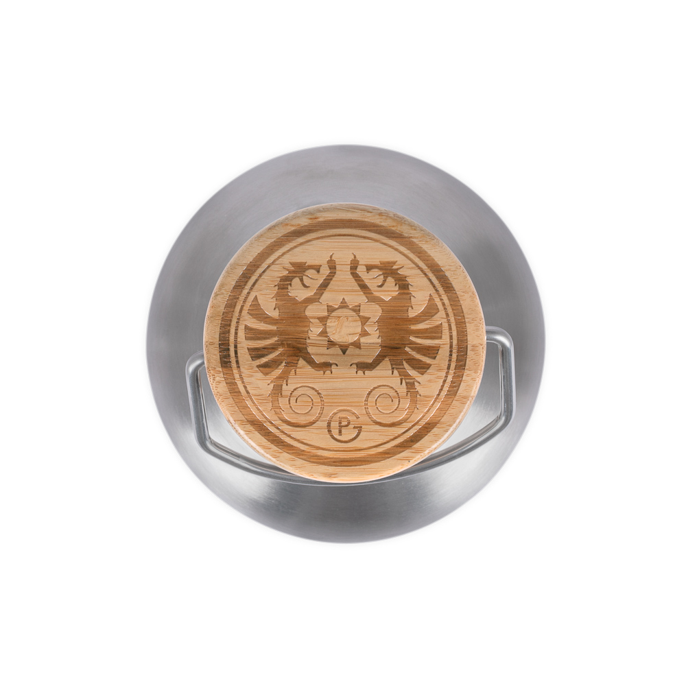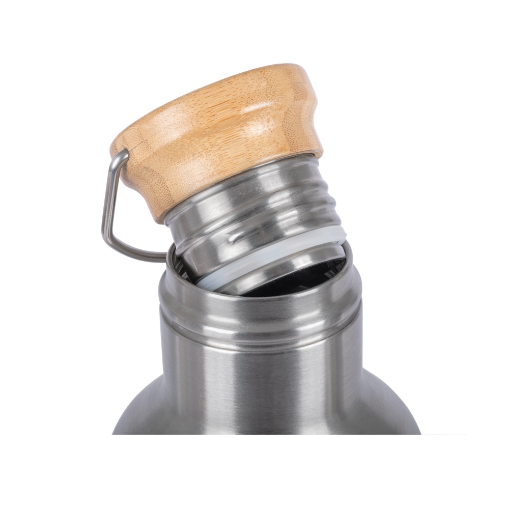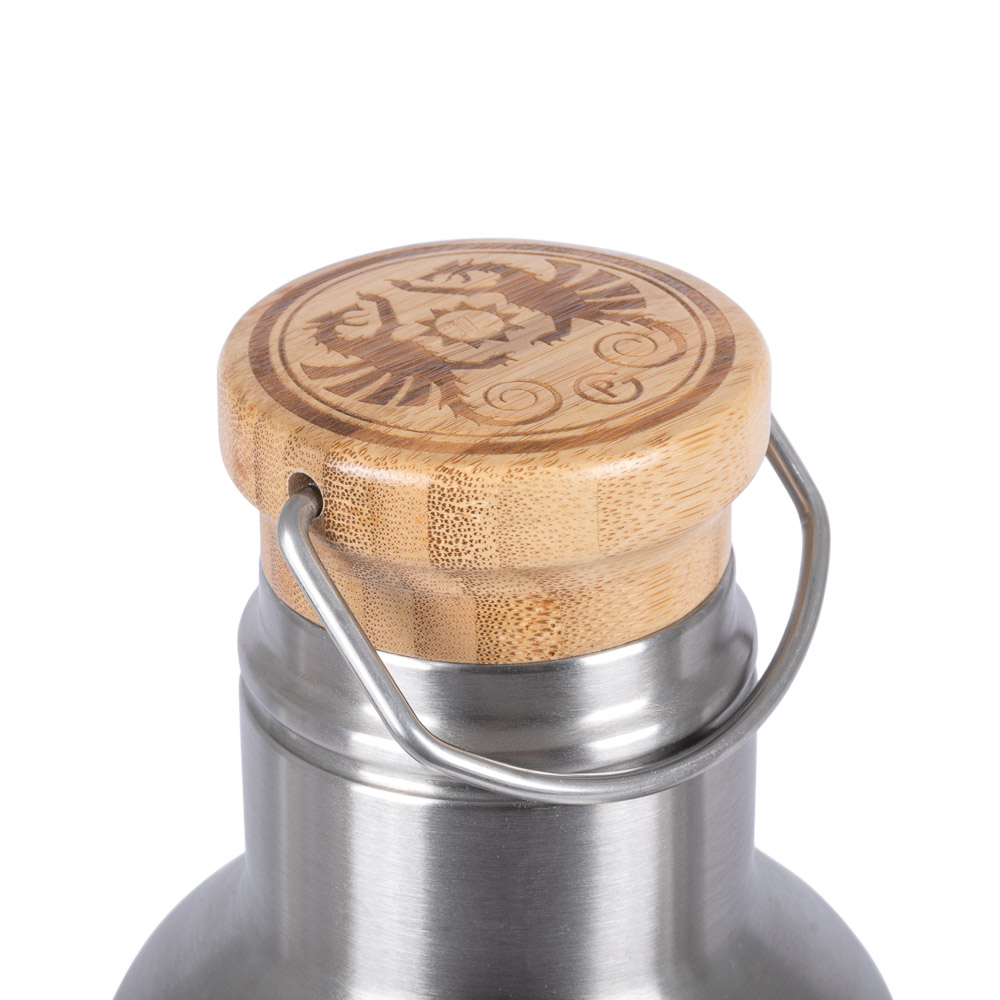 Als zuverlässiger Auslaufschutz dient der Bambusholz-Schraubverschluss mit Silikondichtung. Dieser ist zusätzlich mit einem praktischen Henkel versehen, an dem sich die Flasche mit einem Karabinerhaken z.B. am Rucksack befestigen lässt. Gefertigt aus hochwertigem Edelstahl ist die Isolierflasche nicht nur robust und hält Stürzen problemlos stand, sondern lässt sich auch einfach und hygienisch reinigen und ist zudem völlig geschmacks- und geruchsneutral.