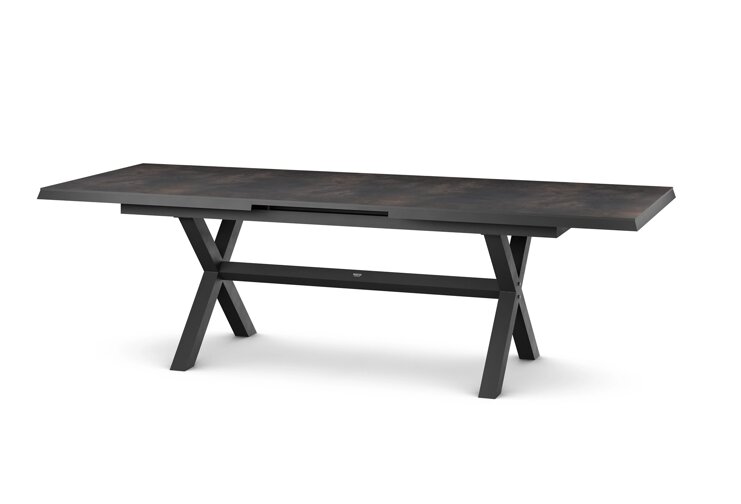 Das Modell Sinco ist mit einem X-Bein Untergestell ausgestattet. Durch diese Anordnung der Bein bietet der Tisch mehr Spielraum für Stühle und Füße der Gästen. Hier können sich die Gäste gemütlich ausstrecken ohne, dass sie sich gegenseitig anstoßen. Zugleich wird durch das X-Bein Untergestell die Last auf der Platte optimal verteilt und es kommt weniger zum wackeln. Um noch mehr Platz zu bekommen, lässt sich der Tisch durch den synchronen Auszugmechanismus kinderleicht vergrößern.