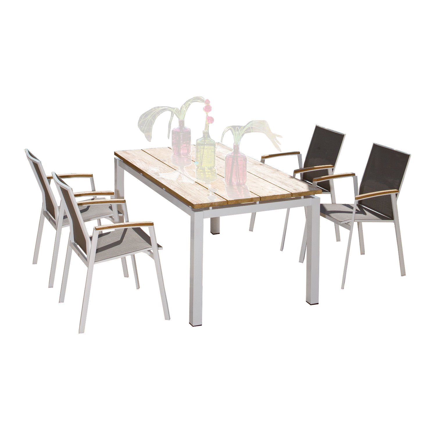 1x Sonnenpartner Sitzgruppe bestehend aus 4x Stapelstuhl Fresno weiß und 1x Tisch Base 160x90 cm mit Teakholz-Tischplatte in Solid Old Teak natur